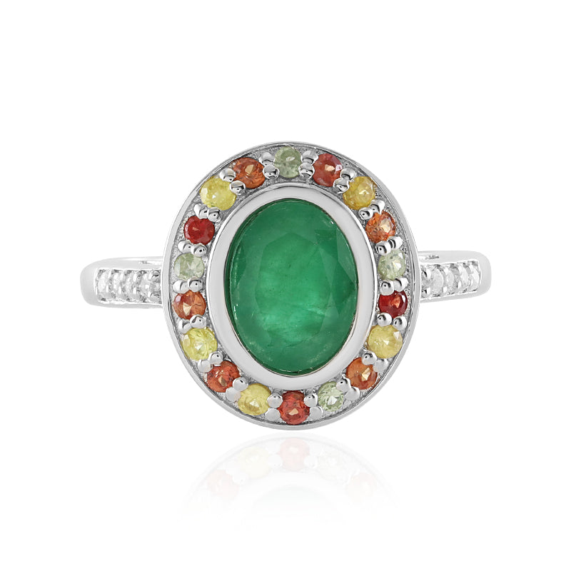 Dieser atemberaubende Ring ist eine wahre Fundgrube natürlicher Schönheit. In der Mitte befindet sich ein brasilianischer Socoto-Smaragd von 1,06 Karat im klassischen Ovalschliff, umgeben von einem lebhaften Halo aus 18 Madagaskar-Saphiren im Rundschliff und 8 funkelnden Zirkonen aus Tansania. Der leuchtend grüne Farbton des Smaragds wird durch die mehrfarbigen Edelsteine perfekt ergänzt und ist in ein hochglänzendes, platiniertes 925er Sterling Silberband eingefasst. Tragen Sie ihn, um Ihrer Abendgarderobe einen Hauch von Eleganz zu verleihen oder als farbenfrohes Statement zu einem legeren Outfit.