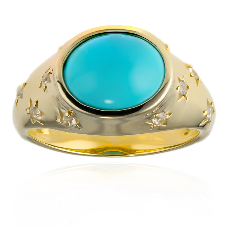 Entdecken Sie die Faszination des amerikanischen Südwestens mit diesem atemberaubenden Ring aus vergoldetem 925er Sterlingsilber mit einem 2,48-karätigen Dornröschen-Türkis als Herzstück. Umarmt von schimmernden kambodschanischen Zirkon-Akzenten, verkörpert dieses Statement-Stück Eleganz. Dieser Ring eignet sich sowohl für besondere Anlässe als auch für den Alltag und ist der perfekte Farbakzent für Ihr Ensemble.
