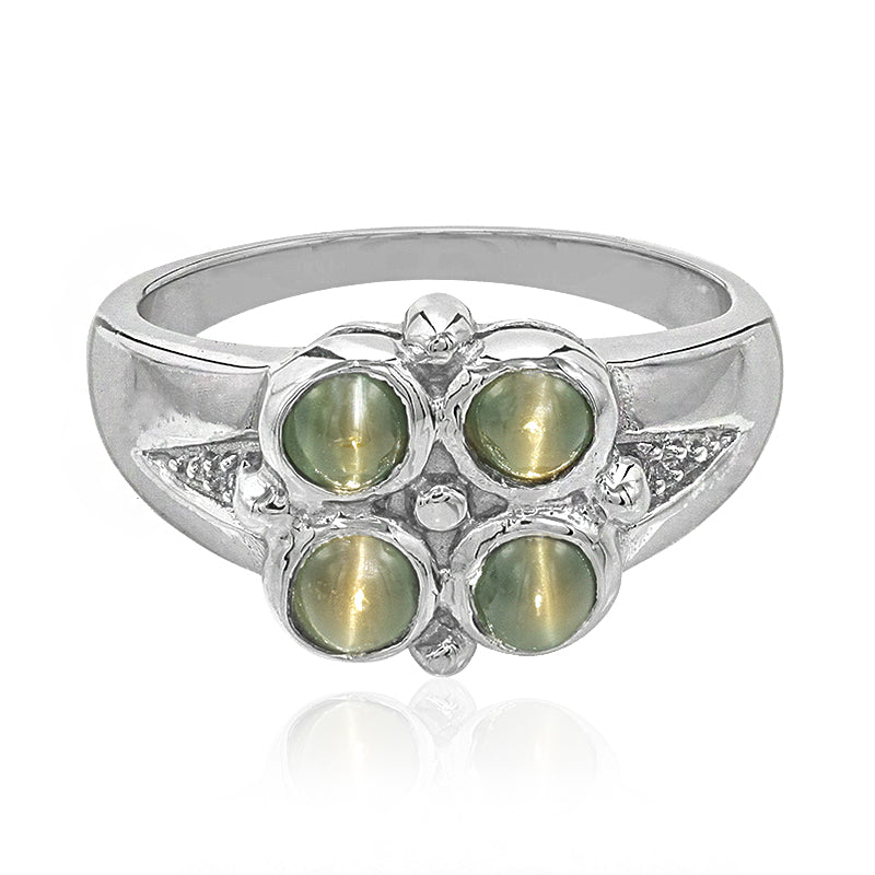 Entdecken Sie die geheimnisvolle Anziehungskraft dieses Rings aus 925er Sterlingsilber, der mit vier indischen Katzenaugen-Alexandriten von insgesamt 0,98 Karat besetzt ist. Jeder Stein hat einen faszinierenden runden Cabochon-Schliff von ca. 3,7 mm und offenbart die wechselnden Farbtöne und den Chatoyant-Effekt, die Alexandrit so begehrt machen. In einer einzigartigen, auffälligen Silberfassung mit einem Gewicht von etwa 3,78 Gramm verkörpert dieser Ring Raffinesse. Er eignet sich perfekt, um sowohl Freizeit- als auch Abendkleidern einen Hauch von Geheimnis zu verleihen und sorgt für Gesprächsstoff bei Ihrem nächsten Anlass.