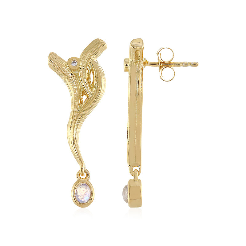 Entdecken Sie den himmlischen Charme dieser eleganten Ohrringe aus vergoldetem 925er Sterlingsilber aus der MONOSONO COLLECTION. Jeder Ohrring ist sorgfältig mit einem AAA-Regenbogenmondstein aus Indien gefertigt, der ein faszinierendes Farbenspiel zeigt. Akzentuiert mit schimmernden Zirkonsteinen aus Kambodscha, ist dieses Paar ein Zeugnis der Raffinesse. Der ausgeprägte ovale Cabochon-Schliff der Mondsteine gepaart mit dem anmutigen Design macht sie sowohl für den Tag als auch für den Abend perfekt und ergänzt jedes stilvolle Ensemble.