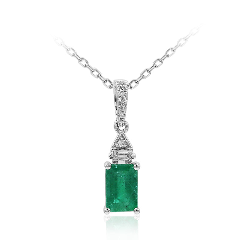 Diese atemberaubende Halskette präsentiert einen üppigen sambischen Smaragd im Oktagon-Schliff von 0,57 Karat, der von funkelnden Diamanten im SI2 (H)-Format von insgesamt 0,05 Karat ergänzt wird. Das geometrische Design aus poliertem 10 Karat Weißgold verleiht jedem Outfit einen modernen Touch. Die zarte 45 cm lange Kette sorgt dafür, dass der Anhänger anmutig am Schlüsselbein sitzt und sich sowohl für den Alltag als auch für besondere Anlässe eignet. Kombinieren Sie ihn mit einem klassischen Kleid mit V-Ausschnitt, um dieses exquisite Stück in den Mittelpunkt zu stellen.