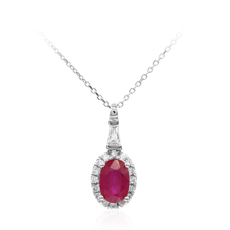 Entdecken Sie den Charme unserer Halskette mit einem AAA-Rubin aus Mosambik, die von Raffinesse zeugt. Der bezaubernde Rubin im Ovalschliff von 0,557 Karat, gefasst in 10 Karat Weißgold, wird durch funkelnde SI2-Diamanten von insgesamt 0,124 Karat ergänzt, die seine Schönheit noch unterstreichen. Dieses elegante Schmuckstück an einer verstellbaren 40,5-45,5 cm langen Kette eignet sich sowohl für den Tag als auch für besondere Abende und wertet jedes Outfit mit seinem satten, purpurnen Farbton auf.