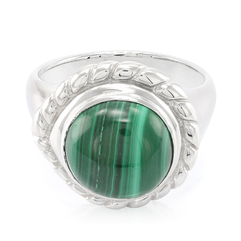 Begeben Sie sich mit diesem schicken Malachit-Silberring auf eine Reise voller Eleganz. Sein 7,61-karätiger Cabochon, der aus den mineralreichen Böden der Demokratischen Republik Kongo stammt, strahlt in einem faszinierenden Grünton. Das Band aus 925er Sterlingsilber mit einem Gewicht von etwa 5,52 Gramm ergänzt den Edelstein mit seinem dezenten Glanz. Dieser Ring ist ideal, um jedem Outfit einen Hauch von Natur zu verleihen. Er ist ein Highlight für gesellschaftliche Anlässe oder ein elegantes Accessoire für den Alltag. Seine großzügigen Abmessungen sorgen dafür, dass die faszinierenden Farbtöne und die handwerkliche Kunstfertigkeit des Rings gut zur Geltung kommen.