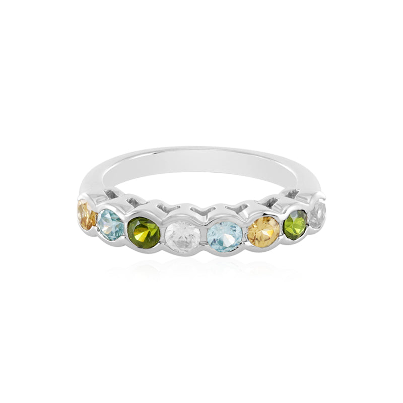Entdecken Sie eine Sinfonie der Farben mit diesem atemberaubenden Ring aus Sterlingsilber, der eine Reihe glänzender Zirkone aus Kambodscha enthält. Jeder der sorgfältig auf etwa 3 mm rund geschliffenen Steine hat insgesamt 1,305 Karat und bietet ein schillerndes Spektrum von satten Grüntönen bis hin zu strahlendem Gelb. Das platinierte Silber bietet eine haltbare und elegante Grundlage, die die lebhaften Farbtöne ergänzt. Dieser Ring eignet sich perfekt für den Alltag oder für besondere Anlässe und passt sowohl zu legeren als auch zu formellen Anlässen. Lassen Sie sich von dem lebendigen Charme dieses farbenfrohen Schmuckstücks verzaubern.