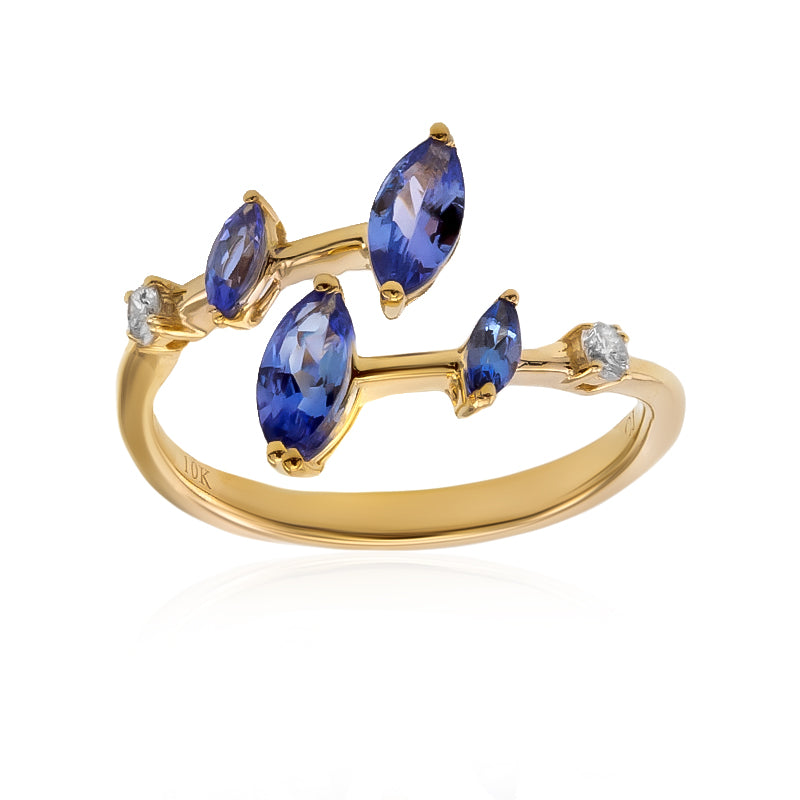 Entdecken Sie den verführerischen Charme dieses handgefertigten Rings aus 10 Karat Gelbgold, der mit einer Reihe von tansanischen Tansaniten im AAA-Marquise-Schliff von insgesamt 0,68 Karat besticht. Akzentuiert mit zwei runden Brillanten von insgesamt 0,05 ct, präsentiert dieser Ring ein atemberaubendes Zusammenspiel von lebhaften blauen Farbtönen und funkelndem Glanz. Er eignet sich sowohl für elegante Anlässe als auch für das tägliche Leben, passt zu jeder Kleidung und wird zu einem begehrten Stück in Ihrer Sammlung.