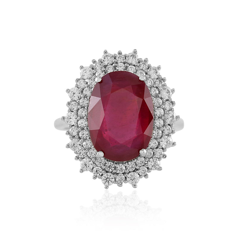 Entdecken Sie die Anziehungskraft dieses atemberaubenden Rings mit einem Madagaskar-Rubin, gekrönt von einem üppigen Edelstein von 7,02 Karat im Ovalschliff. Ein Halo aus funkelnden kambodschanischen Zirkonen mit einem Gesamtgewicht von 1,44 Karat betont das tiefrote Zentrum, das in luxuriösem platinbeschichtetem 925er Sterling Silber gefasst ist. Dieses raffinierte Schmuckstück mit einem Gewicht von ca. 5,09 g ist ein elegantes Statement für jeden Anlass und passt sowohl zur Tages- als auch zur Abendgarderobe. Sein lebendiger Charme macht ihn zu einer zeitlosen Ergänzung Ihrer Schmucksammlung.