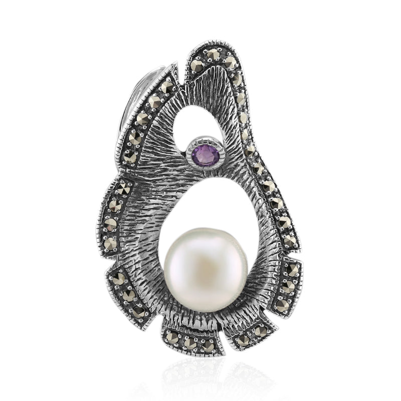 Entdecken Sie die Eleganz dieses Anhängers aus 925er Sterlingsilber mit einer glänzenden Süßwasserperle aus China inmitten eines Halos aus 33 funkelnden österreichischen Markasiten. Ein brasilianischer Amethyst setzt einen farblichen Akzent und rundet das Schmuckstück ab. Seine klassische runde Form und sein Vintage-Charme machen ihn zu einer exquisiten Wahl sowohl für den Alltag als auch für besondere Anlässe. Kombinieren Sie ihn mit einer knackigen Bluse oder einem Abendkleid für einen zeitlosen Look.