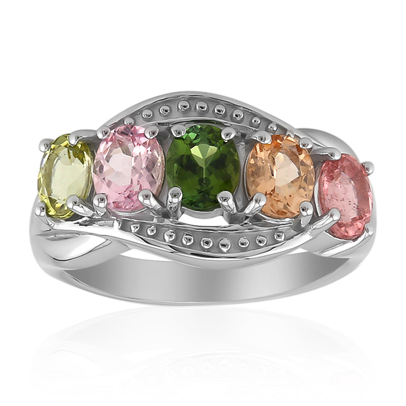 Entdecken Sie den lebendigen Reiz dieses Rings aus 925er Sterlingsilber, der mit einer faszinierenden Reihe von brasilianischen Turmalinen im Ovalschliff von insgesamt 1,445 Karat besetzt ist. Jeder Edelstein strahlt in einem anderen Farbton und fängt die Essenz der reichen Farbpalette Brasiliens ein. Das elegante Silberband mit einem Gewicht von etwa 2,84 Gramm verleiht der traditionellen Fassung einen modernen Touch. Dieser Ring ist ein vielseitiges Accessoire, das sich sowohl für den Alltag als auch für besondere Anlässe eignet und jedem Outfit einen farbigen Akzent verleiht. Kombinieren Sie ihn mit pastellfarbenen oder neutralen Tönen, damit seine Farben richtig zur Geltung kommen.
