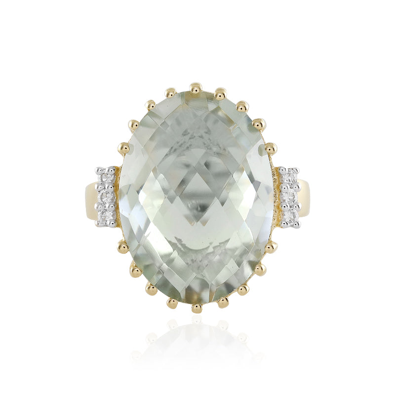 Im Mittelpunkt dieses atemberaubenden Rings steht ein majestätischer 8,63 Karat großer brasilianischer grüner Amethyst im Briolett-Schliff, der elegant von sechs weißen Topasen aus Indien im Rundschliff von insgesamt 0,117 Karat eingerahmt wird. Der harmonische Kontrast zwischen dem leuchtend grünen Amethysten und dem funkelnden Topas erzeugt einen fesselnden Reiz. Mit 925er Sterlingsilber vergoldet, verkörpert dieses Schmuckstück Luxus und Raffinesse. Er eignet sich perfekt, um jeder Kleidung einen Hauch von Eleganz zu verleihen. Er fällt bei formellen Anlässen auf oder verleiht Ihrem Alltagsoutfit einen raffinierten Touch.