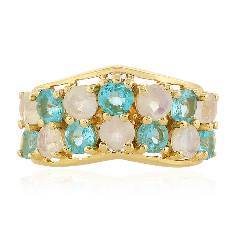 Entdecken Sie die Anziehungskraft dieses faszinierenden goldenen Rings, der mit einer Mischung aus 7 blauen Apatiten im Rundschliff aus Madagaskar und 7 bezaubernden Regenbogen-Mondsteinen aus Indien aufwändig gefertigt wurde. Dieses Schmuckstück aus glänzendem 925er Sterlingsilber mit einer üppigen Goldplattierung hat ein Gesamtgewicht von 3,758 Karat. Das harmonische Gleichgewicht von kühlen Blautönen und schillernden Mondsteinen macht es zu einer vielseitigen Ergänzung Ihrer Sammlung, die sowohl tagsüber charmant als auch abends elegant ist. Ob bei einem legeren Brunch oder einer eleganten Gala, dieser Ring wird Ihr Ensemble mit seinem einzigartigen Charme aufwerten.