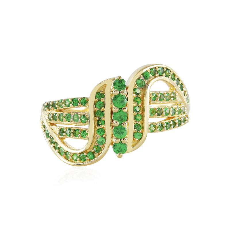 Lassen Sie Ihre Hand mit diesem kunstvoll gestalteten Ring erstrahlen, der mit einer Vielzahl schimmernder Tsavoriten aus Tansania von insgesamt 0,495 Karat geschmückt ist. Die strahlend grünen Edelsteine sind fachmännisch rund geschliffen und in ein luxuriöses vergoldetes 925er Sterlingsilberband gefasst, das etwa 3,4 Gramm wiegt. Die kunstvolle Wölbung des Rings misst 22x20 mm und macht ihn zu einem besonderen Schmuckstück für Galaveranstaltungen oder besondere Abende. Kombinieren Sie diesen exquisiten Ring mit Ihrem Lieblingsabendkleid, um einen raffinierten und verführerischen Look zu kreieren.