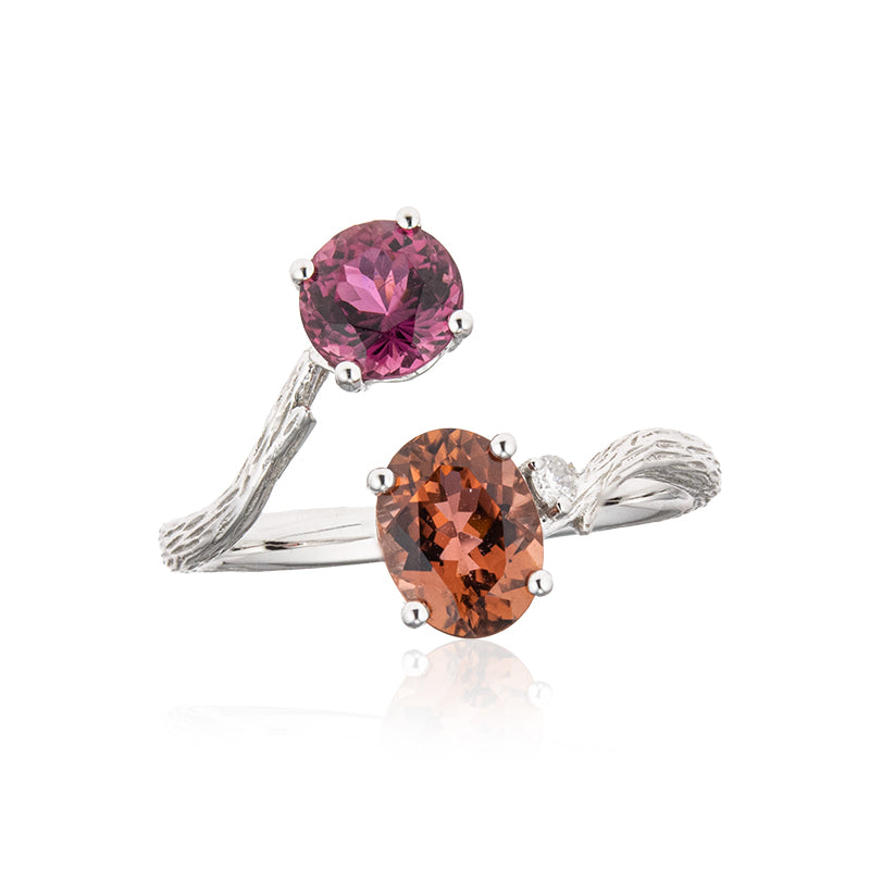 Dieser atemberaubende Ring zeigt zwei strahlende Neon Turmaline aus der Demokratischen Republik Kongo, die in sorgfältiger Handarbeit zu einem Gesamtgewicht von 1,8ct verarbeitet wurden. Der in 585er Weißgold gefasste Ring kombiniert auf elegante Weise leuchtende Farbtöne mit einem Diamanten von 0,027 Karat. Das einzigartige, ineinander verschlungene Design suggeriert ein Gefühl der ewigen Verbundenheit und macht ihn zu einer exquisiten Wahl, um besondere Momente zu feiern. Er passt perfekt zur Abendgarderobe und bringt genau die richtige Menge Farbe in jedes anspruchsvolle Outfit.